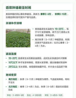 香菜秋季的种植时间为农历8-9月份,此时的气温逐渐下降,而且光照比较柔和,适合种子出芽,如果是8月份播种,最好选择耐热性强的品种,此时的气温高于9月份,后要最好降温措施。
