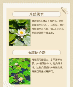 睡莲喜温暖、耐寒性差,最适生长温度为25-30度之间,冬季养殖时温度不宜低于13度,以免植株冻伤,而且睡莲是强光植物,最好将其放在光照充足的环境中,让植株接受全日照,生长的更加繁茂。