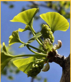雌花结构较简单,具长梗,顶端分叉为两枚珠座(少数为3-5叉),每枚珠座着生一个胚珠,外观类似短柄上托着的小型绿色盘状结构,成熟后发育为种子(即白果)。
