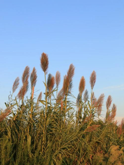 芦苇多种在水边,在开花季节特别漂亮。市场上芦苇的新品种有深水耐寒、抗旱、抗高温、抗倒伏的特点,有短期成型、快速成景的优点。芦苇花序雄伟美观,常用作湖边、河岸低湿处的观赏植物,有固堤、护坡、控制杂草的作用,杆为造纸原料或作编席织帘及建棚材料,根状茎供药用。