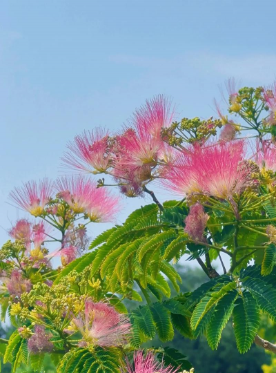 合欢(Albizia julibrissin Durazz.),豆科合欢属的落叶乔木,树冠开展;小枝有棱角,嫩枝、叶子、花序上都有细小绒毛;叶子有针状的外观,较小,很早就会脱落;花序在枝顶部排成圆锥形状,花多为粉红色;果实呈带状,嫩的果实外表有柔毛,成熟的则没有柔毛。花期6—7月,果期8—10月。合欢花粉红菲菲的头状花序形似轻盈柔软的“绒球”,被称为“绒花树”。如果把花球倒转过来,就像马铃上的红缨,故又得名“马缨花”。