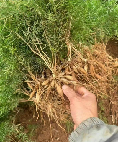 采挖天门冬时,选取根头大、芽头粗壮的健壮母株,将每株至少分成3簇,每簇有芽2-5个,带有3个以上的小块根。切口要小,并抹上石灰以防感染,摊晾1天后即可种植。方法同育苗后的移栽。