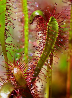 刚刚出现的一种非常美丽的丝叶茅膏菜,在光照充足时叶依然为原种的绿色,但粘液形成的露珠和毛线变红,就像一粒粒红宝石悬挂在树枝上,非常耀眼。