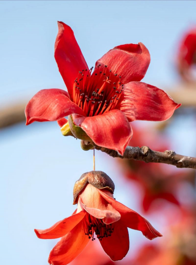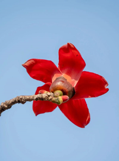 木棉(Bombax ceiba L.),锦葵科木棉属落叶大乔木,植株高25米;树皮为灰白色,幼树的树干通常有圆锥状的粗刺,分枝平展;复叶为掌状;花单生枝顶叶腋,通常红色,也有橙红色,花瓣肉质;在干热地区,花比叶先开放;但在季雨林或雨林气候条件下,则有花叶同时存在的;蒴果为长圆形;密被灰白色长柔毛和星状柔毛;种子多数,为光滑的倒卵形,花期3—4月,果夏季成熟。木棉花盛开时如同尽情燃烧、欢快跳跃的火苗,历来被人们视为英雄的象征。