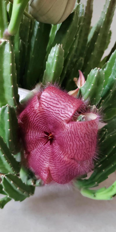 犀角(Stapelia luxurians Dammann ex Rust):其肉质茎青绿色,四棱柱形基部分枝群生,棱间下凹,具稀疏自钰聋状缘。花星形,直径10-12厘米紫红褐色,具淡黄色波状横纹,花瓣学被紫色毫毛。夏、秋季节开放。