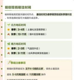 榆树移栽的黄金期为 休眠期(11-3月) 和 秋季(9-10月),具体需结合当地气候调整。北方以春、秋为主,南方可适当延长至初冬。避开高温、多雨及萌芽期是关键。