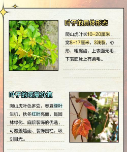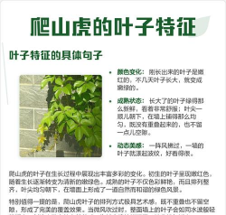 爬山虎的叶子一般是互生的,小叶比较肥厚,边缘有粗锯齿,它的叶片和叶脉都是对称的。叶子的颜色一般为绿色,没有绒毛,叶子背面有百分,叶背的叶脉处有柔毛。但等到了秋季,叶子会变成鲜红色。爬山虎的叶子一般是互生的,小叶比较肥厚,边缘有粗锯齿,它的叶片和叶脉都是对称的。叶子的颜色一般为绿色,没有绒毛,叶子背面有百分,叶背的叶脉处有柔毛。