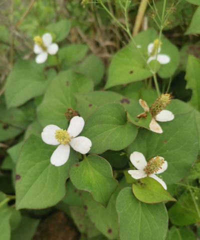 蕺菜,多年生草本,高15-50cm,有腥臭气。茎下部伏地,生根,上部直立。叶互生,心形或阔卵形,长3-8cm,宽4-6cm,先端渐尖,全缘,有细腺点,脉上被柔毛,下面紫红色;叶柄长3-5cm;托叶条形,下半部与叶柄合生成鞘状。穗状花序生于茎顶,与叶对生,基部有白色花瓣状苞片4枚;花小,无花被,有一线状小苞;雄蕊3,花丝下部与子房合生;心皮3,下部合生。蒴果卵圆形,顶端开裂。花期5-8月,果期7-10月。生于山地、沟边、塘边、川埂或林下湿地。