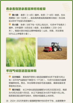 小麦播种时间要根据地区来决定。长城以南的地区主要种植冬小麦,一般是在每年的九月到十月之间播种,然后在第二年的四月到五月之间收割。长城以北的地区主要种植春小麦,一般是在春节过后三月到四月之间播种,当年的八月到九月就可以收割。
