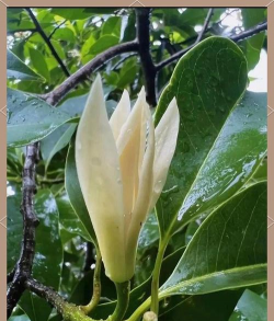 黄桷兰(毛茛目木兰科植物)一般指白兰(木兰科含笑属植物),白兰(Michelia×alba DC.)是木兰科含笑属常绿乔木。因其花白色,香若幽兰,故名白兰。高达17米,枝广展,呈阔伞形树冠;胸径30厘米;树皮灰色;叶薄革质,长椭圆形或披针状椭圆形,叶色浓绿;花洁白清香,花期4~9月,夏季盛开,通常不结实。白兰花的花语来自于它的外形:纯洁的爱,真挚。