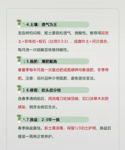 换盆:龙血树的新株于每年4月份进行换盆,老株隔年更换一次。盆土用草炭与沙混合,并加入适量肥料(如腐熟的饼肥或麻酱渣等)。