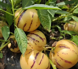 人参果(茄科茄属植物)一般指香瓜茄。香瓜茄(Solanum muricatum Ait.)是茄科、茄属的多年生植物。植株高为60~150厘米,茎基部木质化,茎节上易发生不定根。基部叶为椭圆形,上部叶形如番茄,叶片生有绒毛。浆果为卵圆形或圆锥形,成熟时果皮呈淡黄色,有些有紫色的条形斑纹,果肉呈浅乳黄色。种子呈浅黄色,似茄子的种子。