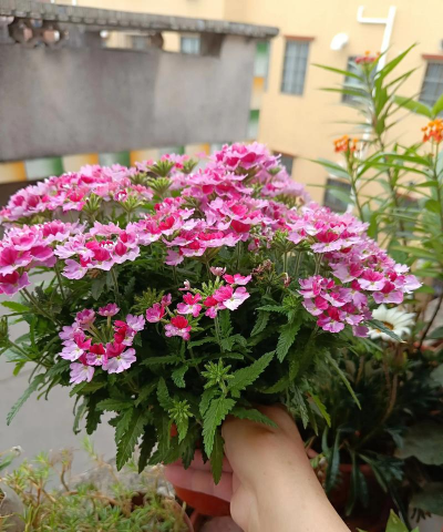 美女樱(Glandularia×hybrida(Groenland&Rümpler)G.L.Nesom&Pruski)是马鞭草科多年生草本植物,适宜生长温度5~25℃。原产于南美洲。开花部分呈伞房状,花色有白、红、蓝、雪青、粉红等,花期为5-11月,性甚强健,可用作花坛、花境材料,也可作盆花成大面积栽植于适合盆栽观赏或布置花台花园林隙地、树坛中。