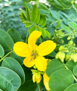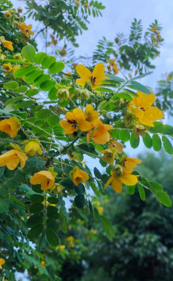 黄槐决明(Senna surattensis(Burm.f.)H.S.Irwin&Barneby)是豆科决明属灌木或小乔木。黄槐决明分枝多,小枝有肋条;树皮光滑,灰褐色;嫩枝、叶轴、叶柄被微柔毛;叶轴及叶柄呈扁四方形;小叶长椭圆形或卵形,下面粉白色;托叶线形,弯曲;总状花序生于枝条上部的叶腋内;花瓣鲜黄至深黄色,卵形至倒卵;荚果扁平,带状,开裂,顶端具细长的喙;种子有光泽;花果期几全年。