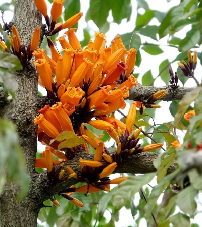 火烧花(Mayodendron igneum(Kurz)Kurz)是紫葳科火烧花属常绿乔木;树皮光滑;叶为奇数羽状复叶对生,小叶卵形或卵状披针形,先端长渐尖,两面无毛;花短总状花序具,着生于老茎或侧生短枝,花序梗长;花萼佛焰苞状,一边开裂,密被柔毛;花冠筒状,橙黄色圆形;果为蒴果线形,无毛,下垂,薄革质;种子卵圆形;花期2-5月,果期5-9月。因其外形与燃烧的火焰及其相似,故称火烧花。