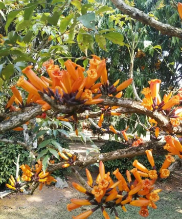 火烧花广泛分布于西双版纳的低海拔地区。是西双版纳3、4月份最为常见的植物之一。火烧花一般先开花,后发叶,属典型的老茎生花。花朵呈橙黄色,小喇叭一般。在西双版纳地区,几乎每个民族都食用火烧花,可炒吃、可煮汤,长期与来形成了外人难以体会的火烧花文化和感情。哈尼族称将其称之为“啊茨麻哈能”,傣族则称之为“埋糯比”。
