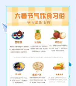 大暑风俗食物有:1、吃仙草:广东很多地方在大暑时节有“吃仙草”的习俗;2、饮伏茶:伏茶,顾名思义,是三伏天喝的茶;3、喝暑羊:华北地区有在大暑这一天喝暑羊(即喝羊肉汤)的习俗等。大暑,二十四节气之一,夏季最后一个节气。小暑后十五日斗指未为大暑;公历7月22—24日交节。“暑”是炎热的意思,大暑,指炎热之极。