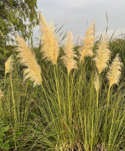 蒲苇:花穗蓬松柔软、银白色,株型优美,花期9-10月。耐寒耐旱,常用于庭院景观,象征爱情忠贞。