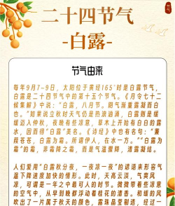 白露节气的含义:凉爽的秋天到来白露是九月的头一个节气。露是由于温度降低,水汽在地面或近地物体上凝结而成的水珠。所以,白露实际上是表征天气已经转凉。白露,是“二十四节气”中的第15个节气,秋季第3个节气,干支历申月的结束与酉月的起始。斗指癸;太阳达黄经165度;于公历9月7-9日交节。