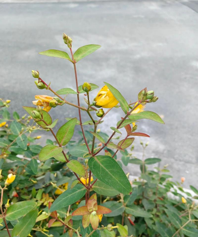 金丝梅(Hypericum patulum Thunb.)是金丝桃科金丝桃属丛状灌木。全株无毛,枝条纵线棱,褐色或红褐色;单叶对生,叶片卵圆形、卵状长圆形或披针状长圆形;花序聚伞状或为单生,萼片宽卵圆形至圆形,果时直伸;花瓣黄色或金黄色,宽卵形至长圆状倒卵形或宽倒卵形,花药淡黄色,子房卵球形,花柱与子房近等长或略短于子房;蒴果卵球形;种子圆柱形,黑褐色;花期5-6月,果期7-8月。