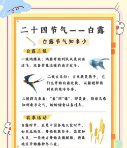 白露的节气特点是天气逐渐转凉,昼夜温差大,寒生露凝。白露是热与凉分水岭,白露代表暑热的结束。白露白天中午气温虽较高,但早晨与夜间已有丝丝的凉意。白露是一年中温差较大的节气。白露节气的风俗有喝白露茶、吃番薯、祭禹王等等。