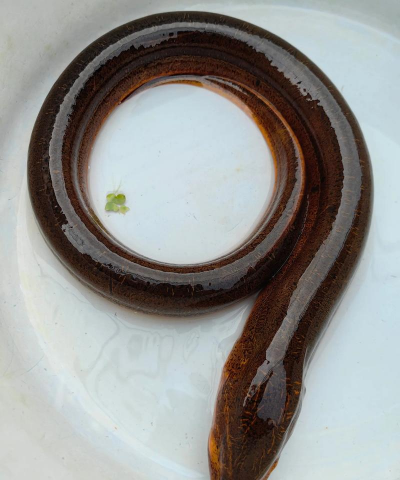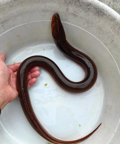 黄鳝,是合鳃目合鳃科黄鳝属[7]硬骨鱼。体蛇形,体表光滑无鳞,前段圆管状,向后渐侧扁,尾部短而尖;头膨大,吻钝;眼小,侧上位,为皮膜所覆盖;口大,前位,口裂超过眼后缘;上颌长于下颌,上、下颌骨及口盖骨具细齿;鳃孔较小,左、右鳃孔在腹面相连,呈倒“V”字形;背鳍、臀鳍及尾鳍均退化,并连在一起。黄鳝因其腹黄而得名。