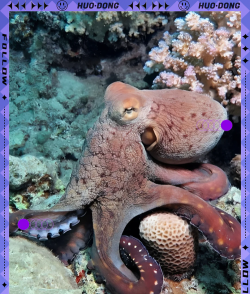 章鱼(Octopus):为章鱼科26属252种海洋软体动物的通称。为头足纲最大科,可分为深海多足蛸亚科(Bathypolypodinae)、爱尔斗蛸亚科(Eledoninae)、谷蛸亚科(Graneledoninae)和蛸亚科(Octopodinae)。体卵形或卵圆形,肌肉强健,外套腔开口窄,体表一般不具水孔。腕吸盘1列或2列。雄性左侧或右侧第3腕茎化,腕腹缘具精沟,末端具勺状舌叶;茎化腕不能自断。漏斗外套锁退化。具1对退化针状内壳或无内壳。若具齿舌,齿舌侧齿一般单尖。胃和盲肠位于消化腺后部。