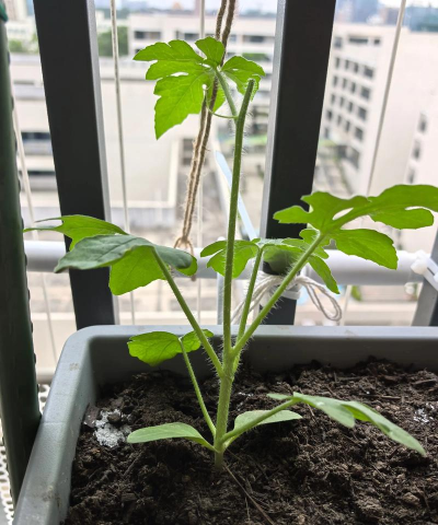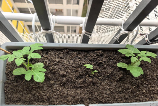 由于空间较小,可以让西瓜藤攀爬到架子或网上,并用绳子固定。