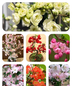 贴梗海棠:花梗短粗或接近无梗,花朵贴近枝干。