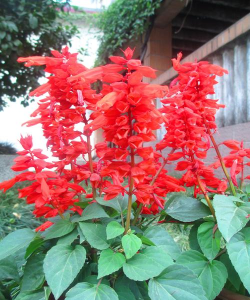 一串红(Salvia splendens)红色花朵密集排列在花序上,花期长,是典型的串状花卉代表。