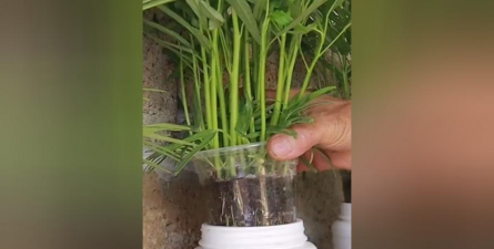 健壮叶片插入瓶身孔洞,倒入清水,约一周至半个月生根。
