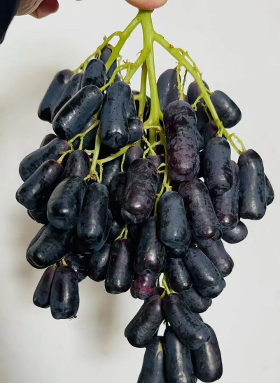 蓝宝石葡萄(学名:Vitis vinifera'Lan Bao Shi')是葡萄科、葡萄属植物,别名:月光之泪,属欧亚种。为中熟品种,天然无核,果穗较大,穗重2-3千克,果粒为长圆形,最长的超过了5.5厘米,平均粒重7.7克,最大的果粒能重达10克以上,果粒大小均匀一致,果顶凹陷,果粒美观,每个果都有窝,所以又叫酒窝葡萄。
