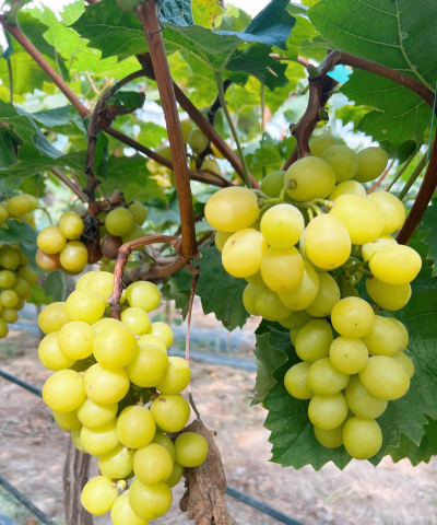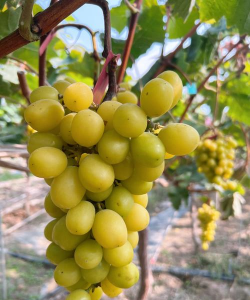 阳光玫瑰葡萄,是葡萄科葡萄属植物。其根系发达;嫩梢绿色、无绒毛、新梢嫩尖叶多为浅白色,带绒毛,新梢成熟后为黄褐色;叶片大,扇形中厚;两性花,果肉较软,有浓郁的玫瑰香味;三月上旬萌芽,五月上旬开花;八月中旬果实开始成熟。阳光玫瑰葡萄因果实含糖量较高,果肉鲜脆多汁,鲜食品质极优,有玫瑰香味,故名阳光玫瑰。