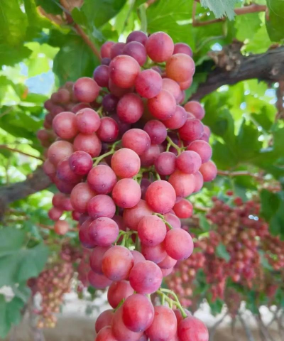 火焰无核葡萄又称葡萄,是葡萄科葡萄属的木质藤本植物。火焰无核葡萄嫩梢绿带微红色,新梢半直立,绿色;幼叶淡紫红色,叶片中等大小,有光泽,皱折,心形,绿色,较薄,一年生成熟枝暗红褐色,节间中等长,两性花;果穗圆锥形,果粒近圆形,紫红色;在新疆鄯善地区4月中旬萌芽,5月中旬开花,7月上旬果实开始成熟。