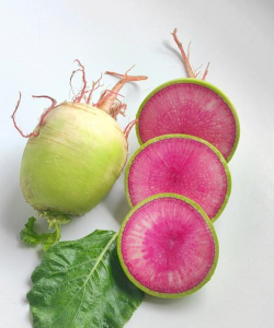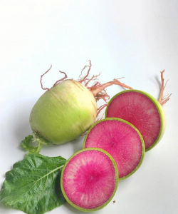 心里美萝卜,外皮呈绿色,里面呈鲜艳的玫红色,颜色非常漂亮,由此而得名。其皮薄肉脆、多汁,多以凉拌食用,有生津止渴的作用。所含热量较少,纤维素较多,吃后易产生饱胀感,有助于减肥。具有下气、消食、除疾润肺、解毒生津、利尿通便的功效。