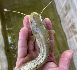 贪食,500克左右的幼鱼便大量吞食鲫鱼、鲤鱼等。适宜生活在水温20~25℃水域。普遍的体上没有鳞,身体表面多黏液,有扁平的头和大口,上下颌共有四根胡须,上长下短,利用此须能辨别出味道。