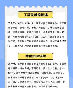 1、种植时间:丁香树苗的种植时间在每年春季4-5月份。2、整地施肥:将地块深耕,再把土壤整细耙平,并施农家肥。3、做畦挖穴:在地里做畦,并挖出种植穴,最后施入肥料。4、栽种养护:将丁香树苗放进种植穴中,并覆土掩埋,最后浇足定根水。