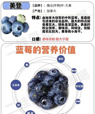 可自花授粉,属中熟品种。锐蓝:果实初呈绿色,成熟时呈深蓝色。蓝峰蓝莓:具有连年丰产、抗病力强的特点。南方高丛蓝莓:主要栽培于中国中部和南部。兔眼蓝莓:果实黑色,单果重0.5g左右。