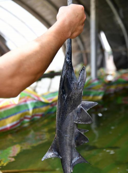 中华鲟的鳞片一般呈深灰色或灰棕色,有时也有些微微的金色或银色光泽。中华鲟的鳞片比较硬,具有一定的光泽度,不容易脱落。这种颜色可以帮助中华鲟在水中更好地融入环境,避免被天敌发现,是一种自我保护的机制。中华鲟是一种珍贵的淡水鱼类,因其在长江中游的分布,也被称为长江之王。