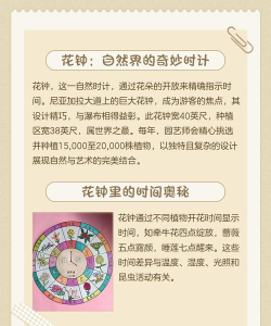 林奈花钟:由瑞典植物学家林奈提出,根据花卉开放时间规律排列,如蛇床花(2点)、牵牛花(4点)、昙花(21点)等,但受气候影响较大。如需更详细的地点或历史背景,可参考具体来源链接。