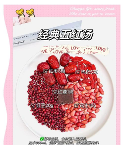 5、红糖:红糖味甘,性温,归脾经,具有益气补血、健脾暖胃等功效。五红汤中加入红糖,可以增强补气血的作用。
