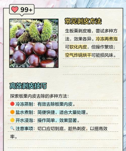 如果是煮熟的栗子去掉外皮还有栗衣,可采用冰箱冷冻法去除栗衣,将其冷却后放入冰箱内冷冻两小时,可使壳肉分离、剥起来既快、栗肉又完整