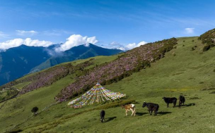 植物特征 :多品种,包括巴朗杜鹃、褐毛杜鹃等,花色丰富(粉、紫、白等),常与羌山景观结合。