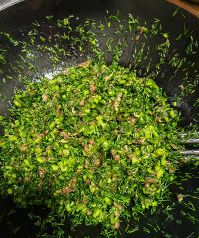 茴香用盐泡是为了杀毒除菌,同时茴香的味道也比较重,用盐水稍微浸泡一下可以减淡茴香的味道,保留茴香的清香。如果在搅拌过程中觉得费劲,可以再适当加入一些大豆油起到润滑作用。这样一个茴香馅就彻底做好了。