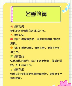 1、修剪时间:樱桃树在春、夏、冬三季都可以进行修剪。2、打顶摘心:将顶端的枝条剪除,促进樱桃树萌发侧枝。3、夏剪新梢:把长势细弱的芽、过密枝剪除。4、短截长枝:樱桃树在冬季会进入休眠期,此时植株的生长缓慢,在短截过长的枝条,促使植株安全越冬。