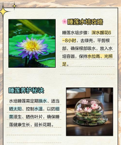 浸泡催芽:小睡莲种子打小孔,放置在清水中浸泡7天。移栽上盆:将幼苗放置在容器中,选择干净的河水或湖水来养护。后期养护:夏季天气炎热,需要1-2天换水一次。注意事项:睡莲根系出现黑腐,要及时对根系进行修剪,而且睡莲事喜光的植物,需要让植株进行充分的光照。