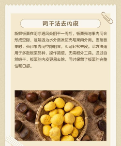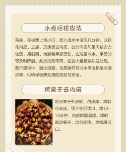 给熟板栗去皮要将它切开一个口子再放入沸腾的水中浸泡一小时左右,这样就能轻松从切口处将板栗剥开。或将熟板栗放入冰箱冷藏两小时左右,板栗经过冷藏后收缩,内部的栗子肉回合表皮分离从而变得更容易剥开,不过这样会影响板栗的口感。