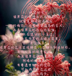 彼岸花寓意为生死两隔,永不相见,生长习性注定花与叶无法相遇;它还寓意着能唤起前世记忆,是黄泉路上唯一的色彩;彼岸花在日本寓意着悲伤的回忆,表达恋人思恋之情;但在朝鲜则寓意着相互思恋;在中国是寓意着优美魅惑,其花朵优雅高傲,花瓣呈聚状。