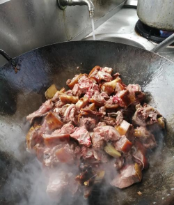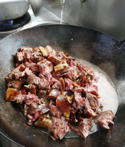 4、狗肉煮熟后,切不能用刀切,要用手撕成丝,以保持火锅的独特风味。