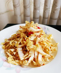 处理白菜心:白菜心洗净切成丝备用。处理配菜:香菜和葱切成末,干辣椒切段。浇热油:锅中烧热油,加入干辣椒炸出香味,并浇入菜中。加调料:继续加入生抽、醋、盐、糖、味精,搅拌均匀即可。